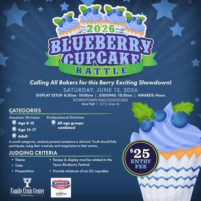 Amateur and pro bakers alike, it's your time to shine at the Texas Blueberry Festival's showdown, all in support of survivors at the Janelle Grum Family Crisis Center of East Texas.