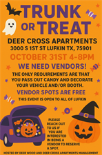 Join us for a fun-filled evening at our Annual Trunk or Treat, Open to the public! Bring your familt and friends for a safe and festive night of Halloween fun.