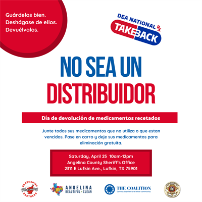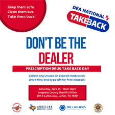 Drug Take Back Day at Angelina County Sheriff's Office! Bring your old, expired, unused, and surplus prescription, OTC, and pet meds to the ACSO for disposal. This event is free, anonymous and a drive-thru!