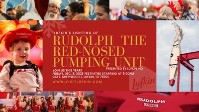 Join us for a magical evening at the 'Lighting of Rudolph the Red-Nose Pumping Unit,' presented by LUFKIN IND. On December 5th, 2025, starting at 5:00pm and the Lighting Ceremony starts after the announcement from Lufkin Industries so be there early. Downtown Lufkin will transform into a festive wonderland. This beloved holiday tradition is a heartwarming experience unique to Lufkin that brings our community together.