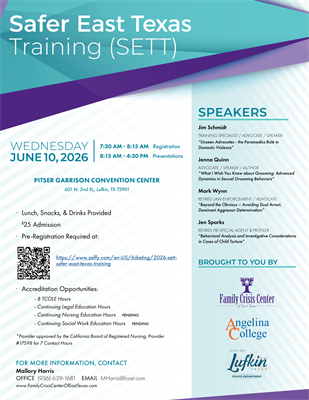 Janelle Grum Family Crisis Center of East Texas is proud to present the 2025 Safer East Texas Training (SETT) on Wednesday, June 10, 2026, at the Pitser Garrison Convention Center, located at 601 N. 2nd Street, Lufkin, TX.
