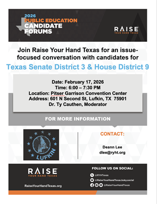 Join us for an education-focused forum featuring the candidates of SD 3 and HD 9. All candidates have been invited. Moderator- Dr. Ty Cauthen, Workforce Solutions of Deep East Texas, Executive Director
