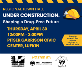 At the Regional Town Hall on April 30 (12-2p; lunch provided) in Lufkin, you can expect to learn from expert speakers and hear thoughtful panel discussions about preventing harmful substance use.